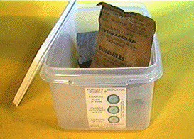 | The container is a normal air tight (more or less) container like that you can buy at the supermarket. The desiccant is bagged. It can be recharged by baking in the oven. (Instructions are on the bag). A moisture indicator is taped to the front of the box. |