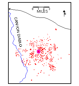 The idea that the huge Canyon Diablo mass was blasted into small bits is supported by the lack of large specimens. The largest Canyon Diablo recovered is the 639 Kg on display in the Meteor Crater Museum. Specimens over ten kilograms are rare and those over 100 Kg are only a handful. The adjoining map gives a rough idea of the distribution of the small specimens around the crater.