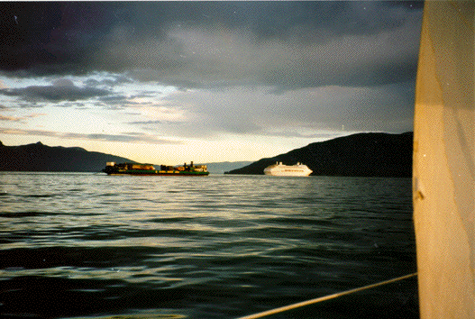 | A cruise ship and a barge passing in the mouth of Gastineau Channel. It's only a few days after the summer solstice, so the sun is rising at about 4:00 am. |