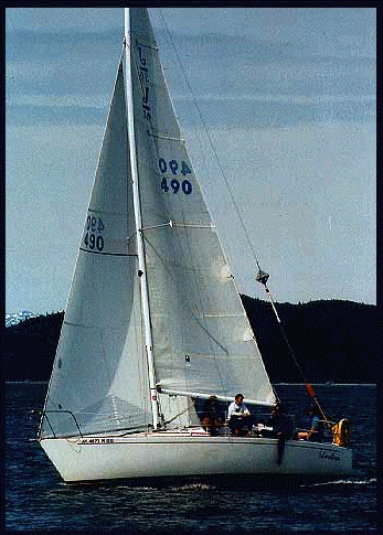 | Shoreless trying to catch up during one design racing, fall '98. (Only the two J/30's showed up for that day.) |