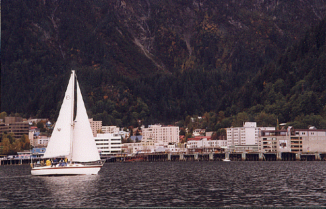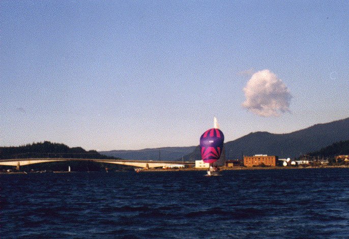 | Webmaster Evan sails up Icy Strait on the first day of the 1998 'Round Admiralty Race. |