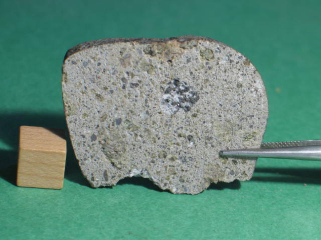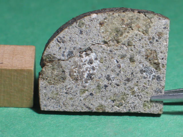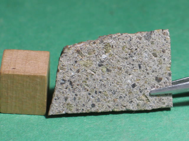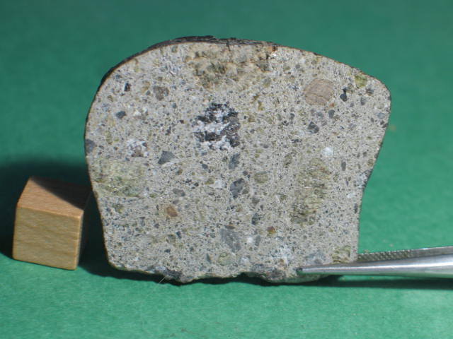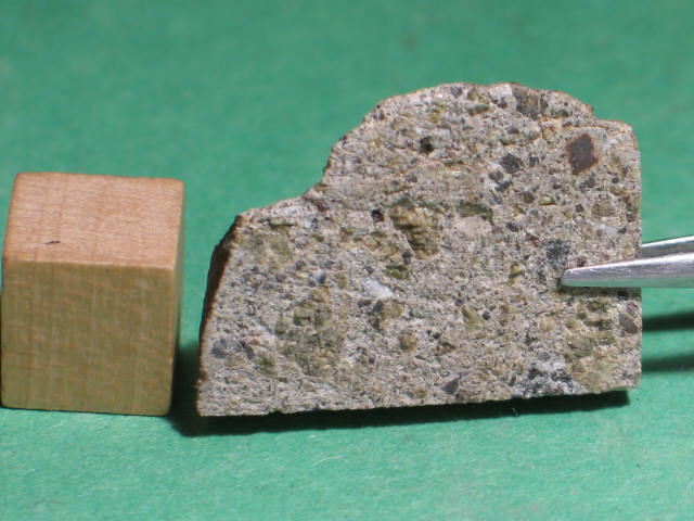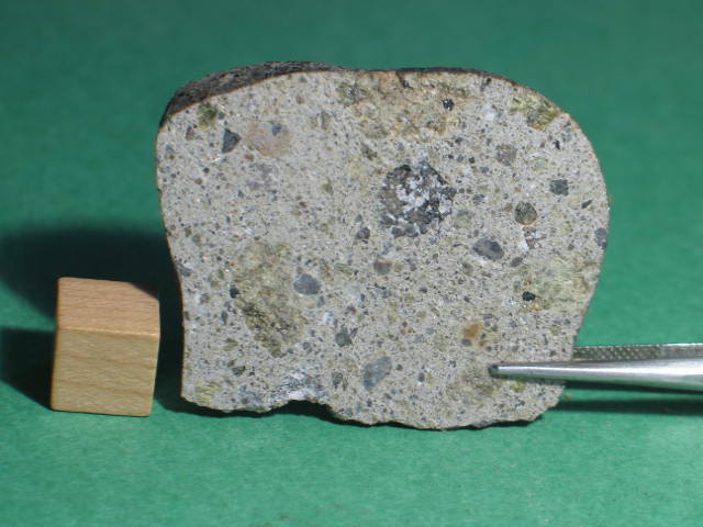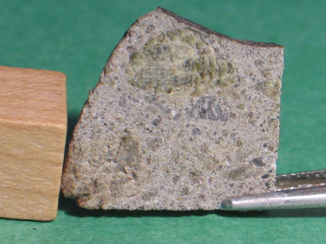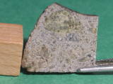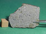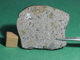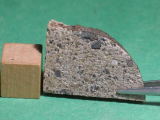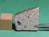 Description: Very fresh fragmental breccia consisting predominantly of angular diogenitic orthopyroxene grains (up to 2 mm across) plus <10 vol.% basaltic eucrite clasts and one finer-grained fragmental breccia clast. Orthopyroxene (Fs17.1Wo1.1; Fs26.8Wo2.6; FeO/MnO = 27-30) , exsolved pigeonite (orthopyroxene host Fs49.7±0.0 Wo1.8-4.0, FeO/MnO = 32-33; clinopyroxene lamellae Fs25.5-28.7Wo39.6-38.5, FeO/MnO = 27), calcic plagioclase, chromite, ilmenite and troilite. Petrography and analysis by A. Irving.